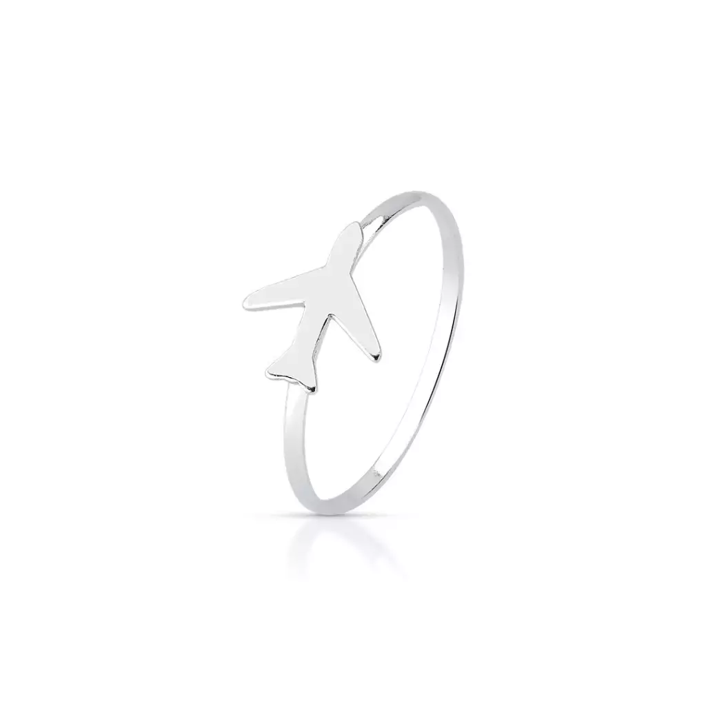 Anel Avião Plano Liso de Prata 925, composto de prata liso em forma de anel com um avião bidimensional no parte superior;