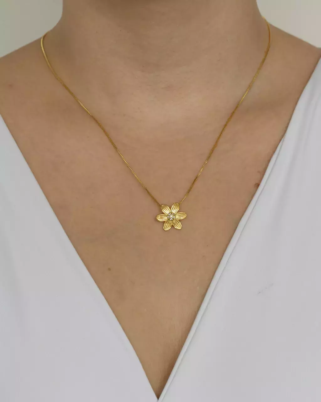 Um acessório sofisticado e delicado, perfeito para compor looks elegantes no dia a dia ou em eventos especiais. O pingente em formato de flor é trabalhado com detalhes texturizados nas pétalas e microzircônias centrais que proporcionam brilho extra. A corrente dourada é leve, resistente e garante ótimo caimento no pescoço.