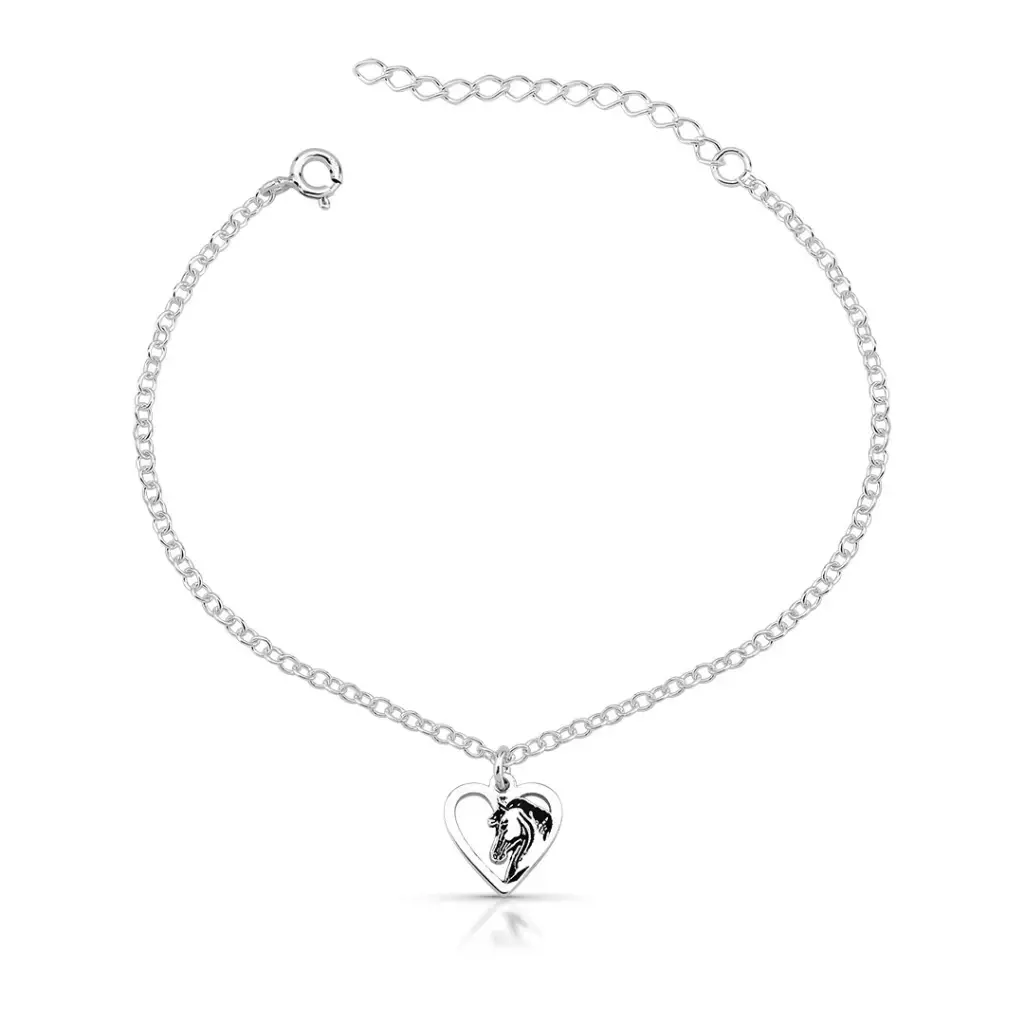 Pulseira Coração Vazado com Cavalo de Prata 925, esse produto é feito com um corrente elo portugues 040, vem com Pingente Coração Vazado com Cavalo, que é composto por prata liso em forma de um coração vazio com um rosto de cavalo no meio com detalhes de envelhecimento;